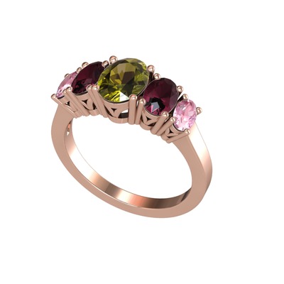 Peridot, kök yakut ve pembe kuvars 925 ayar rose altın kaplama gümüş yüzük