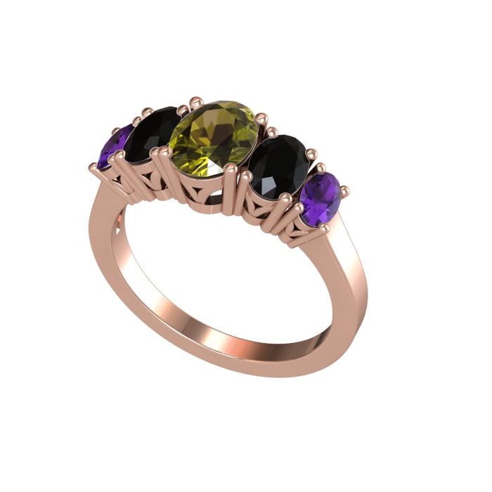 Peridot, siyah zirkon ve ametist 8 ayar rose altın yüzük