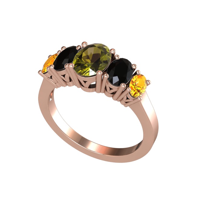 Peridot, siyah zirkon ve sitrin 18 ayar rose altın yüzük