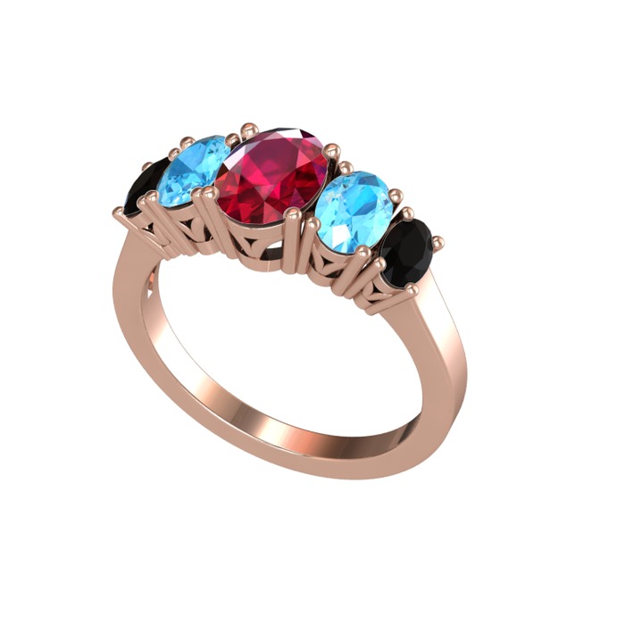 Rodolit garnet, akuamarin ve siyah zirkon 18 ayar rose altın yüzük