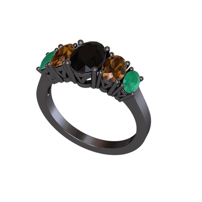 Siyah zirkon, dumanlı kuvars ve kök zümrüt 925 ayar siyah rodyum kaplama gümüş yüzük
