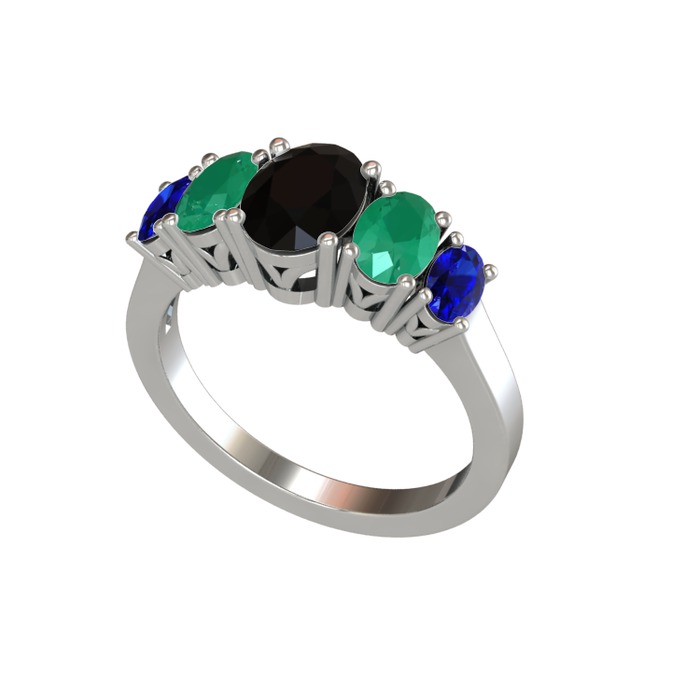 Siyah zirkon, kök zümrüt ve lab safir 8 ayar beyaz altın yüzük