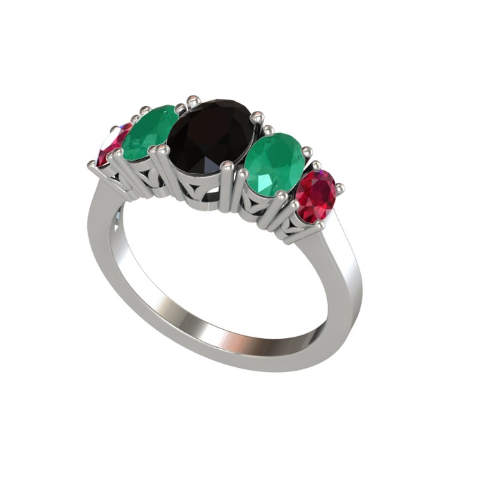 Siyah zirkon, kök zümrüt ve rodolit garnet 18 ayar beyaz altın yüzük