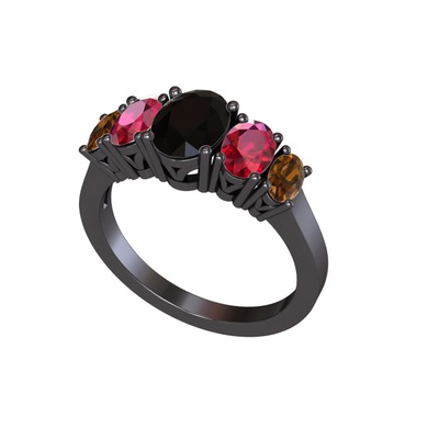Siyah zirkon, rodolit garnet ve dumanlı kuvars 925 ayar siyah rodyum kaplama gümüş yüzük