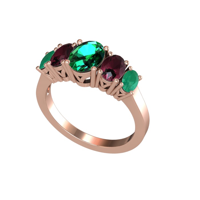 Yeşil kuvars, kök yakut ve kök zümrüt 8 ayar rose altın yüzük