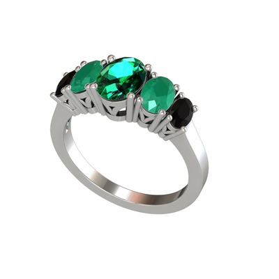 Yeşil kuvars, kök zümrüt ve siyah zirkon 14 ayar beyaz altın yüzük