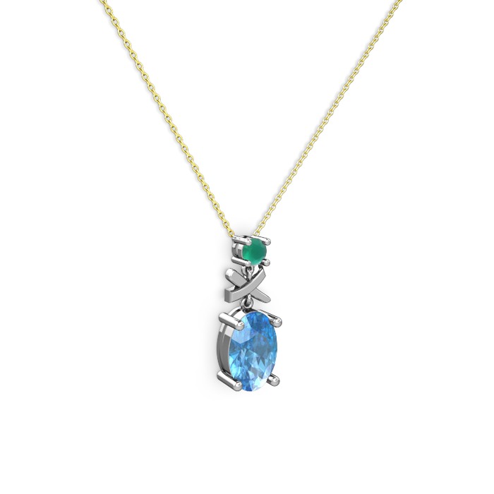 Akuamarin ve kök zümrüt 14 ayar beyaz altın kolye (40 cm gümüş rolo zincir)