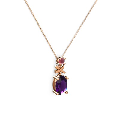 Ametist ve kök yakut 18 ayar rose altın kolye (40 cm rose altın rolo zincir)