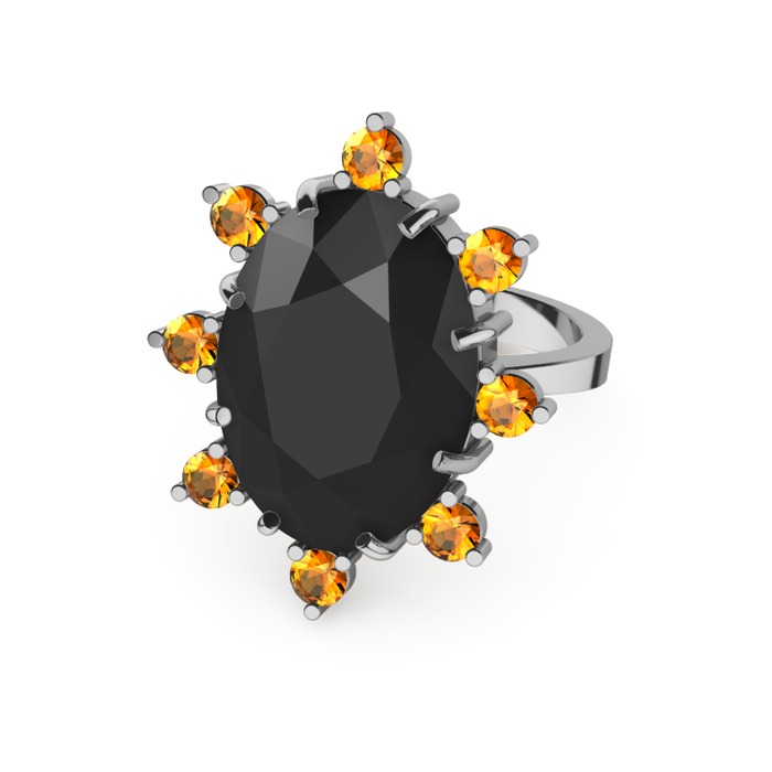 Siyah zirkon ve sitrin 14 ayar beyaz altın yüzük