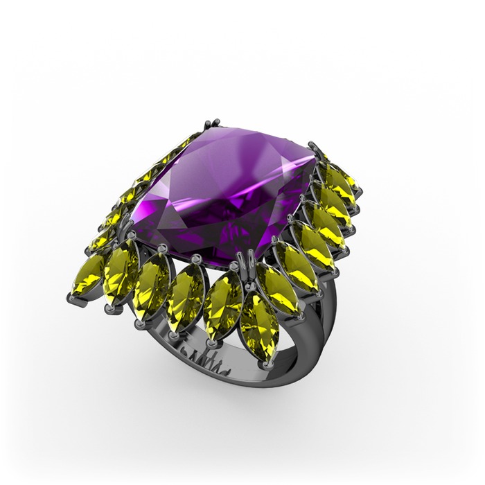 Ametist ve peridot 925 ayar siyah rodyum kaplama gümüş yüzük
