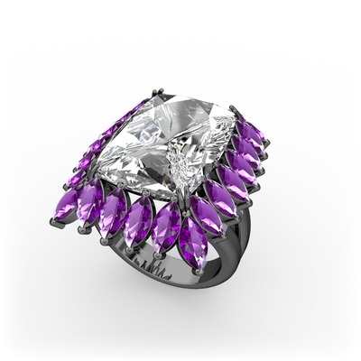Beyaz zirkon ve ametist 925 ayar siyah rodyum kaplama gümüş yüzük