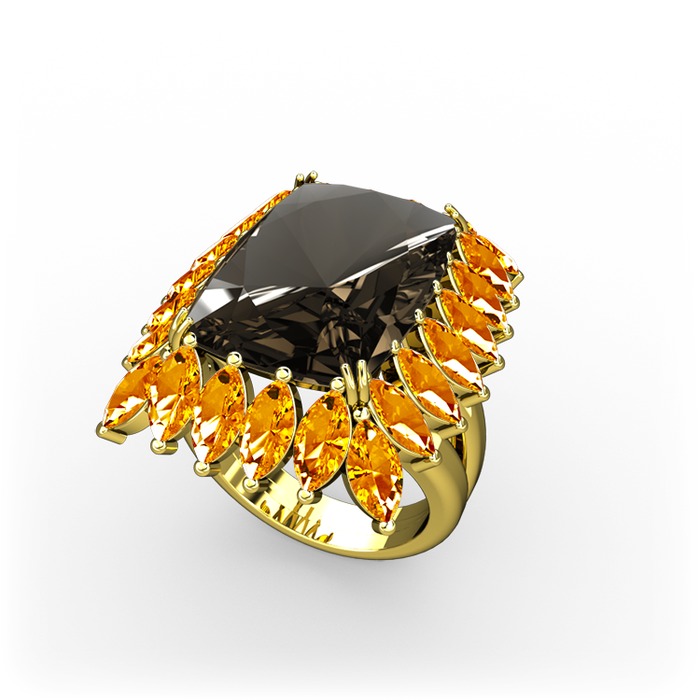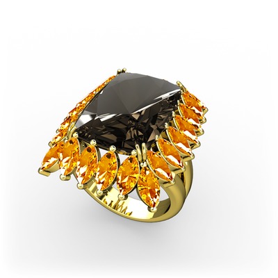 Dumanlı kuvars ve sitrin 925 ayar altın kaplama gümüş yüzük