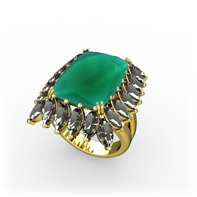 Kök zümrüt ve dumanlı kuvars 14 ayar altın yüzük