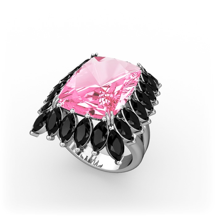 Pembe kuvars ve siyah zirkon 14 ayar beyaz altın yüzük