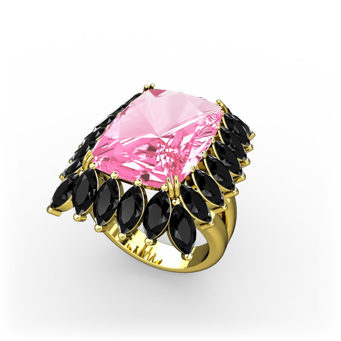 Pembe kuvars ve siyah zirkon 925 ayar altın kaplama gümüş yüzük