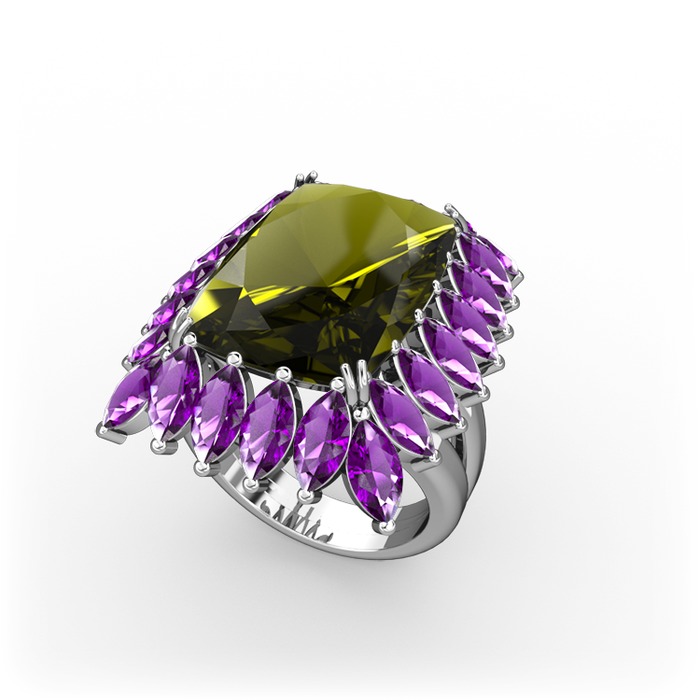 Peridot ve ametist 18 ayar beyaz altın yüzük
