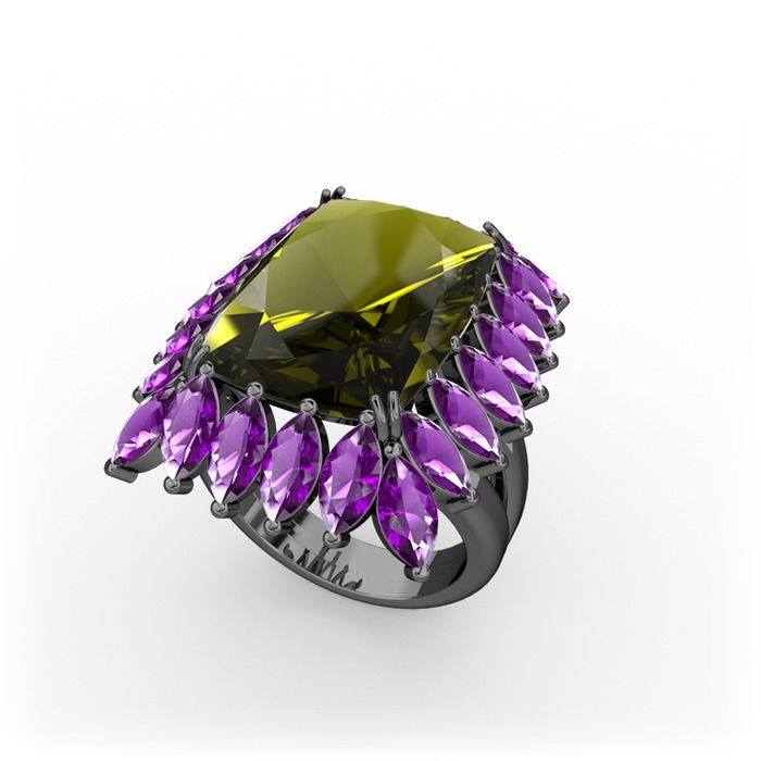 Peridot ve ametist 925 ayar siyah rodyum kaplama gümüş yüzük