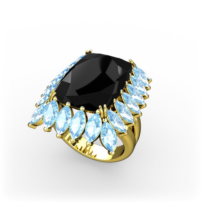 Siyah zirkon ve akuamarin 8 ayar altın yüzük
