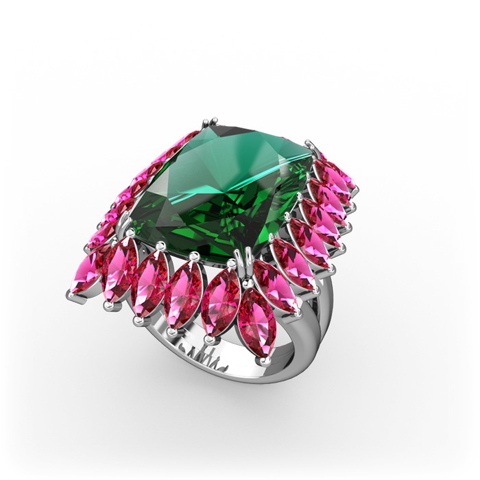 Yeşil kuvars ve rodolit garnet 14 ayar beyaz altın yüzük