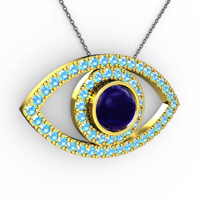 Lab safir ve akuamarin 18 ayar altın kolye (40 cm gümüş rolo zincir)
