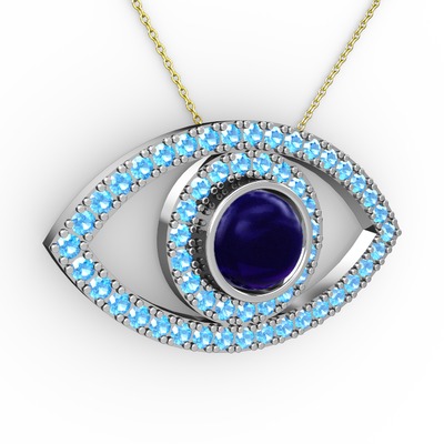 Lab safir ve akuamarin 18 ayar beyaz altın kolye (40 cm altın rolo zincir)