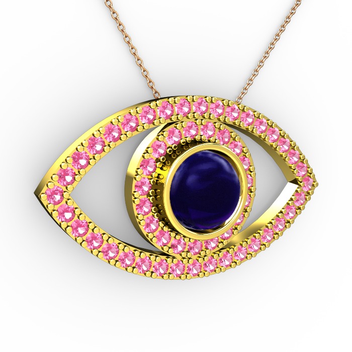 Lab safir ve pembe kuvars 8 ayar altın kolye (40 cm rose altın rolo zincir)