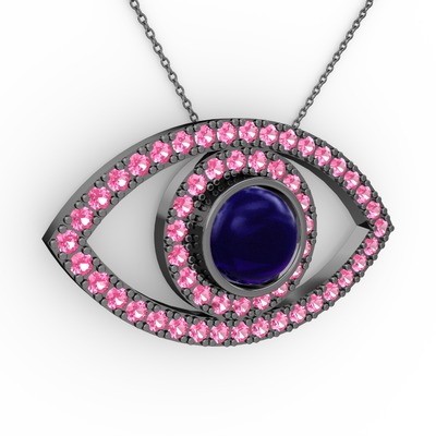 Lab safir ve pembe kuvars 925 ayar siyah rodyum kaplama gümüş kolye (40 cm gümüş rolo zincir)