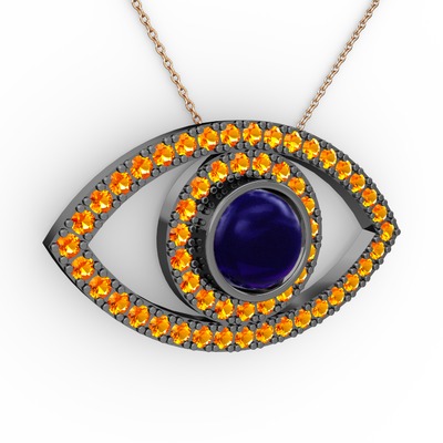 Lab safir ve sitrin 925 ayar siyah rodyum kaplama gümüş kolye (40 cm rose altın rolo zincir)