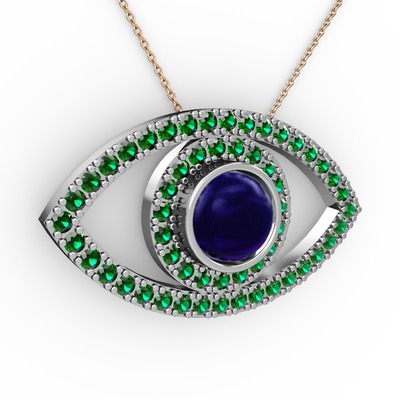 Lab safir ve yeşil kuvars 14 ayar beyaz altın kolye (40 cm rose altın rolo zincir)