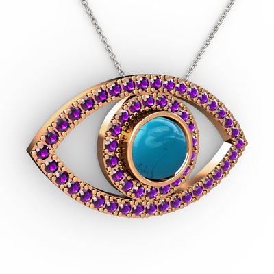 Turkuaz ve ametist 8 ayar rose altın kolye (40 cm beyaz altın rolo zincir)