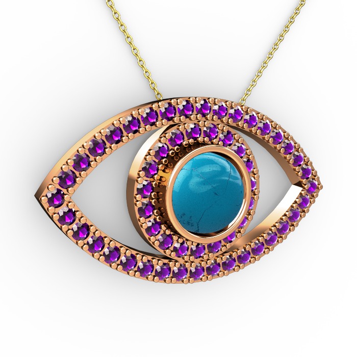 Turkuaz ve ametist 925 ayar rose altın kaplama gümüş kolye (40 cm gümüş rolo zincir)