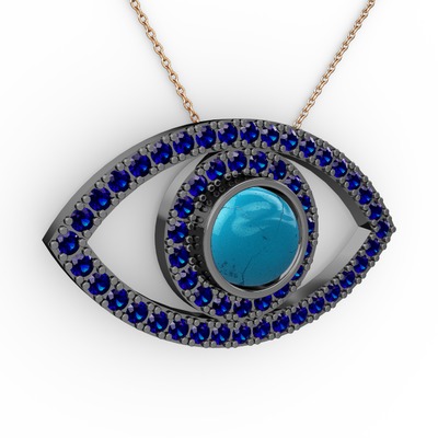 Turkuaz ve lab safir 925 ayar siyah rodyum kaplama gümüş kolye (40 cm rose altın rolo zincir)