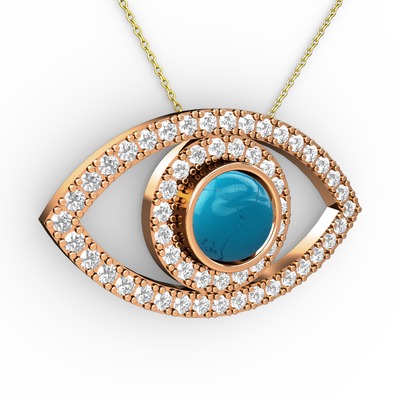 Turkuaz ve swarovski 14 ayar rose altın kolye (40 cm gümüş rolo zincir)