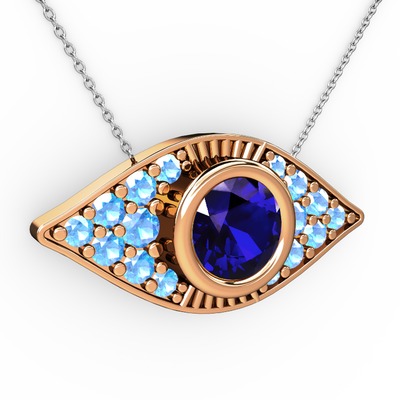 Lab safir ve akuamarin 925 ayar rose altın kaplama gümüş kolye (40 cm beyaz altın rolo zincir)