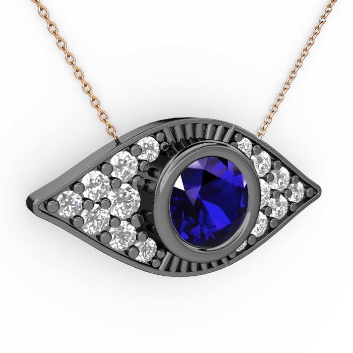 Lab safir ve beyaz zirkon 925 ayar siyah rodyum kaplama gümüş kolye (40 cm gümüş rolo zincir)