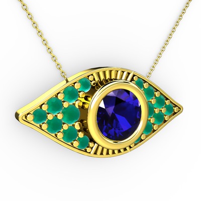 Lab safir ve kök zümrüt 925 ayar altın kaplama gümüş kolye (40 cm gümüş rolo zincir)