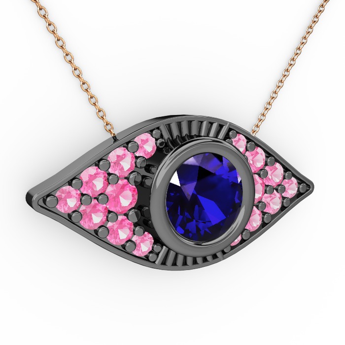 Lab safir ve pembe kuvars 925 ayar siyah rodyum kaplama gümüş kolye (40 cm gümüş rolo zincir)