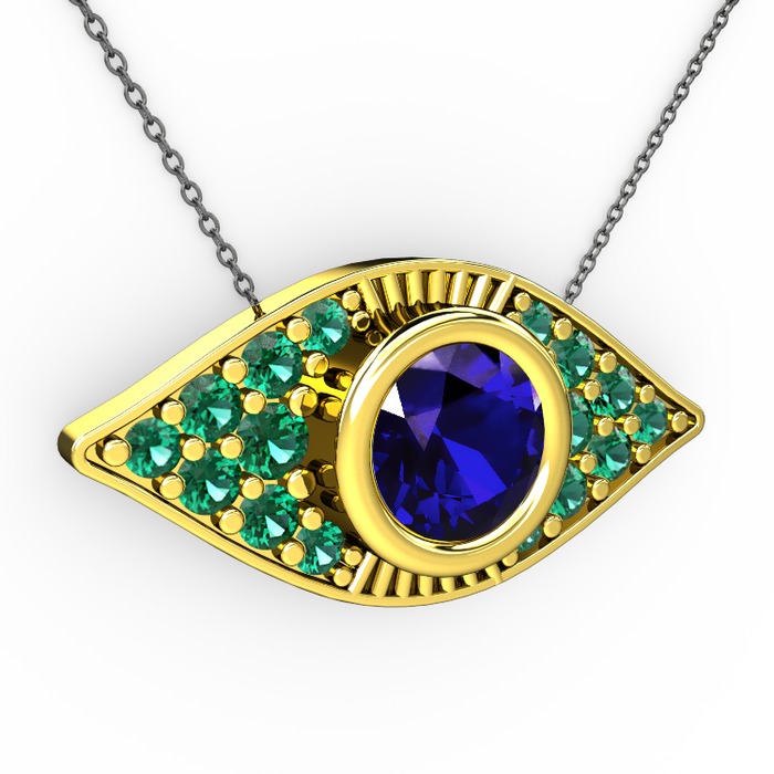 Lab safir ve yeşil kuvars 14 ayar altın kolye (40 cm gümüş rolo zincir)