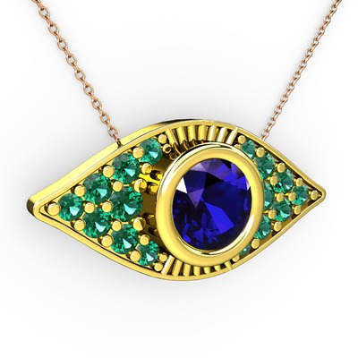 Lab safir ve yeşil kuvars 14 ayar altın kolye (40 cm gümüş rolo zincir)