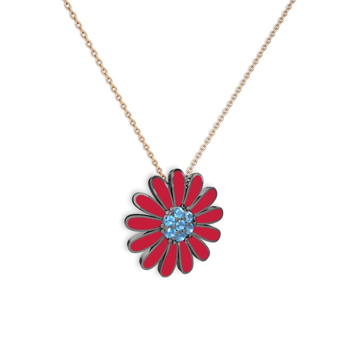 Akuamarin 925 ayar siyah rodyum kaplama gümüş kolye (Kırmızı mineli, 40 cm rose altın rolo zincir)
