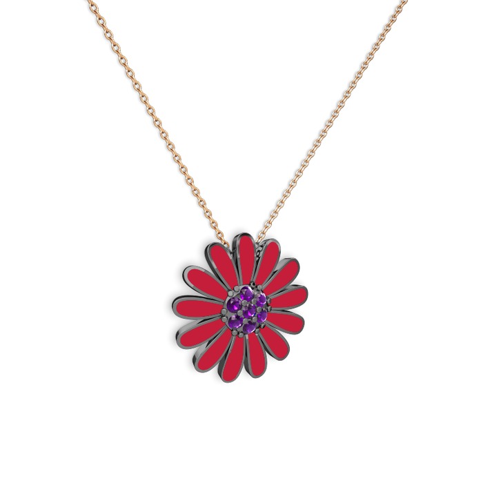 Ametist 925 ayar siyah rodyum kaplama gümüş kolye (Kırmızı mineli, 40 cm rose altın rolo zincir)