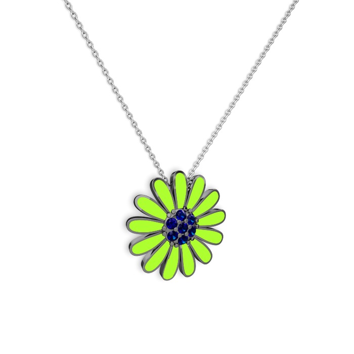 Lab safir 925 ayar siyah rodyum kaplama gümüş kolye (Neon yeşil mineli, 40 cm beyaz altın rolo zincir)