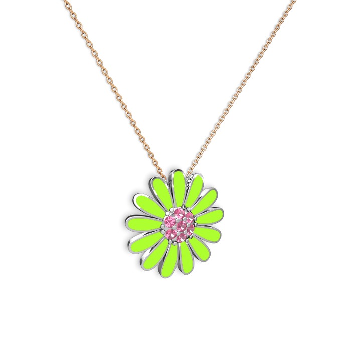 Pembe kuvars 14 ayar beyaz altın kolye (Neon yeşil mineli, 40 cm rose altın rolo zincir)