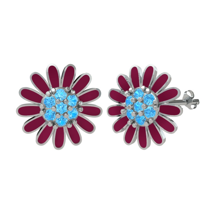 Akuamarin 18 ayar beyaz altın küpe (Bordo kırmızı mineli)