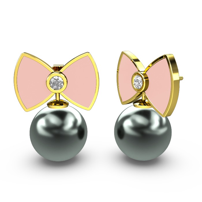 Siyah inci ve beyaz zirkon 14 ayar altın küpe (Pastel pembe mineli)