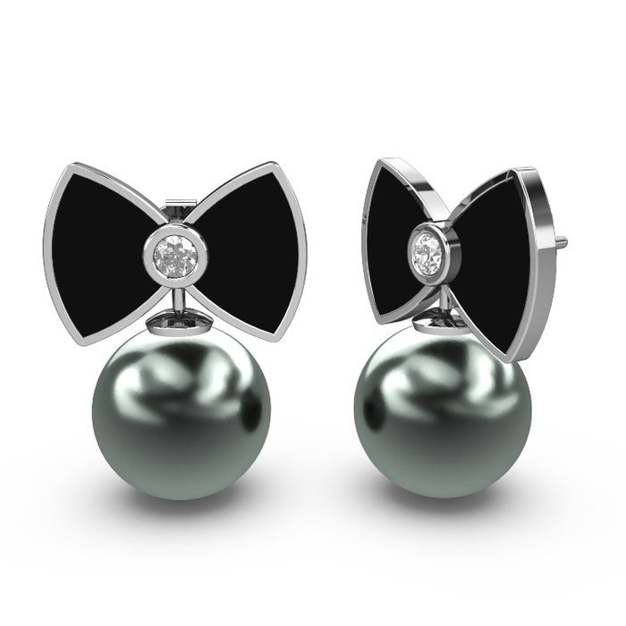 Siyah inci ve beyaz zirkon 14 ayar beyaz altın küpe (Siyah mineli)