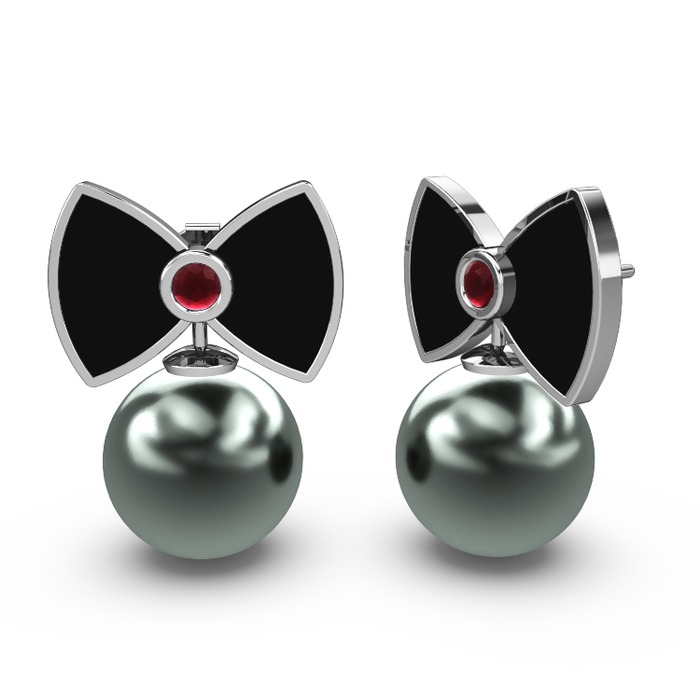 Siyah inci ve kök yakut 14 ayar beyaz altın küpe (Siyah mineli)