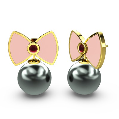 Siyah inci ve kök yakut 18 ayar altın küpe (Pastel pembe mineli)