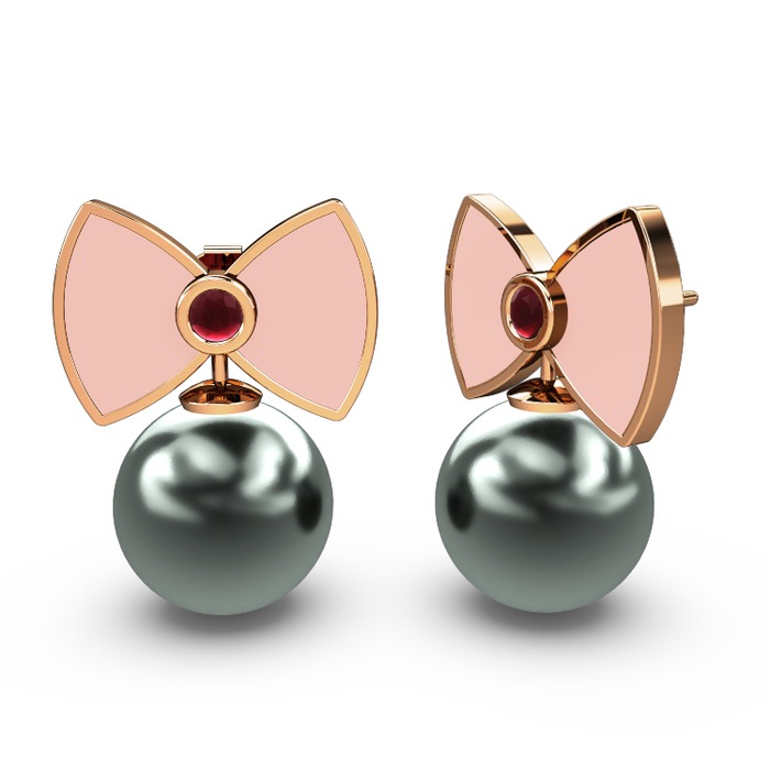 Siyah inci ve kök yakut 8 ayar rose altın küpe (Pastel pembe mineli)