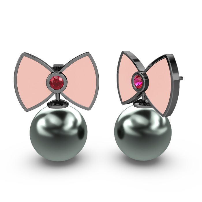 Siyah inci ve rodolit garnet 925 ayar siyah rodyum kaplama gümüş küpe (Pastel pembe mineli)